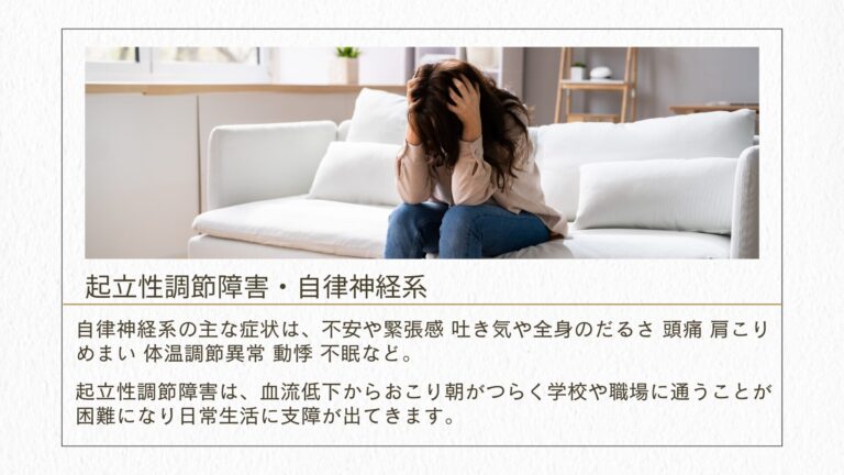 自律神経の不調(自律神経失調症)は、交感神経と副交感神経のバランスが崩れ体のさまざまな機能に影響を与え、多くの身体的および精神的症状を引き起こす可能性があります。自律神経系は、交感神経と副交感神経から成り、心臓の動きや消化、呼吸、体温調節などの自動的な生理機能を調節しています。自律神経の不調は、以下のような症状を引き起こすことがあります。
